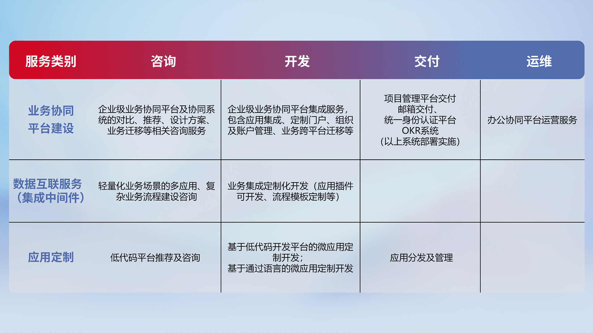针对钉钉、、企微、、IDaas等平台级产品提供产品的规划、、方案、、、交付、、定制化开发等服务,,,实现如统一协同办公、、、智能客户服务、、混合会议管理、、、智能数据查询、、等业务场景,,,,实现数字化转型。。