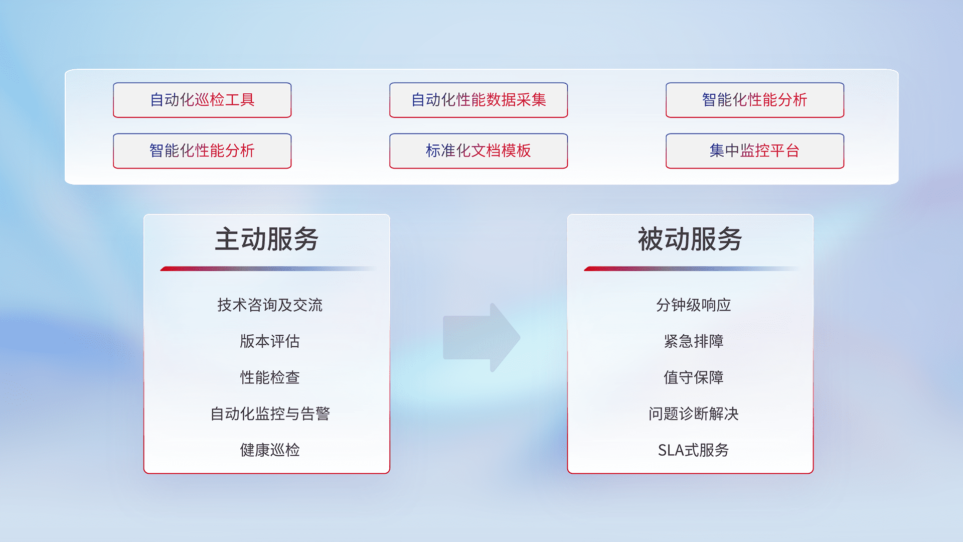 智能化工具和标准化文档,,保障服务质量,,提供主动服务(包含技术咨询、、、、版本评估、、、、性能检查、、、自动化监控与告警、、、、健康巡检)和被动服务包含(分钟级响应、、、、紧急排障、、、值守保障、、、问题诊断解决、、、SLA服务)。。